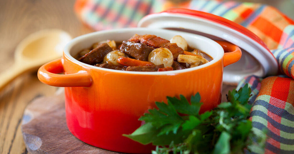 - Add the mushrooms and cook covered, until meat and vegetables are tender, an additional 60 minutes.