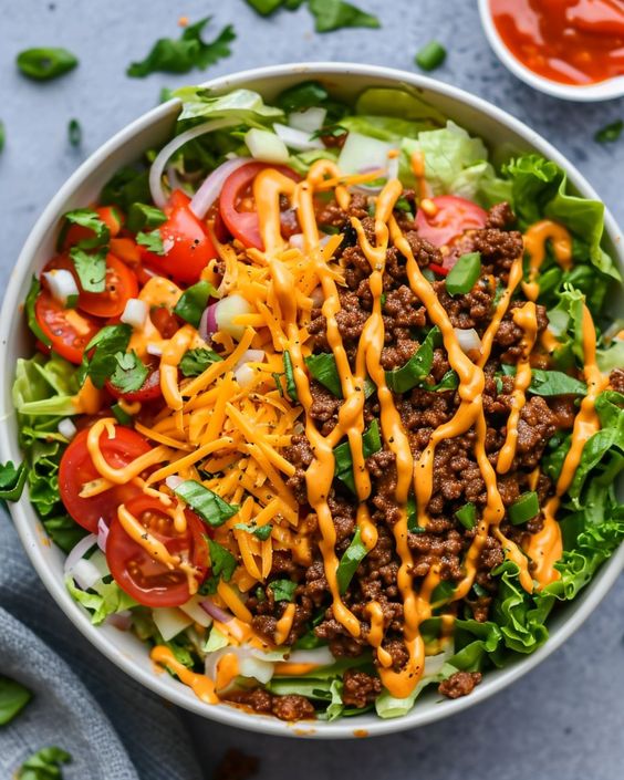 You know the one, the only burger in the world with it’s own theme song “Two all beef patties, special sauce….”. That burger is exactly what this salad tastes like, only it’s a meal you can eat whenever you like!