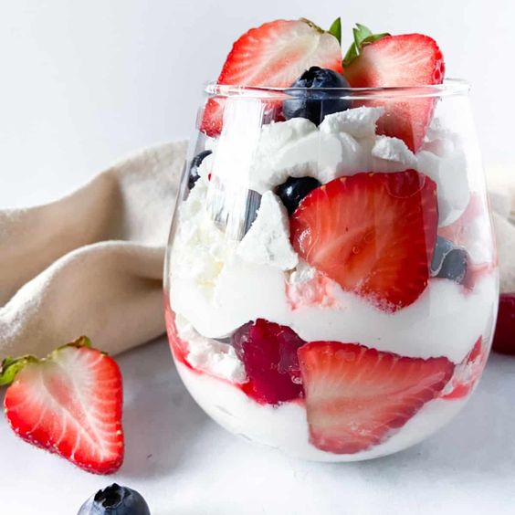 Eton Mess is a classic British dessert made with berries (I used strawberries), whipped cream, and crushed vanilla meringue cookies. You can assemble it in one large bowl or layer it in individual glasses.
