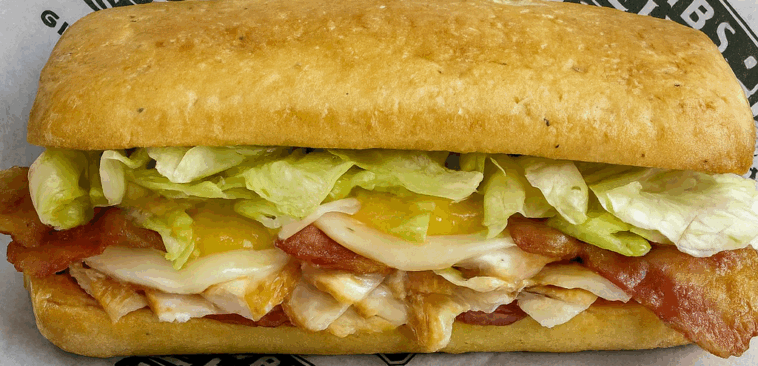 Layer chicken, beef bacon, both cheeses, lettuce, tomato, and onions evenly.