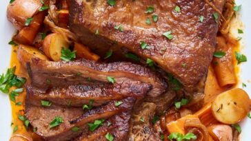 This Braised Brisket recipe is slow cooked in the oven with potatoes, carrots and onions. Slicing the brisket half-way through cooking assures that the meat is tender and flavorful. About Time Prep Time 30 mins Cook Time 3hrs 30mins Total Time 4hrs Go to the next page to get the Ingredients More